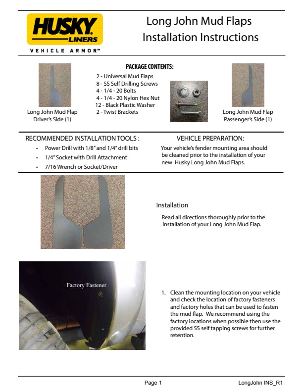 Husky Long John Mud Flaps combine the lateral coverage of a fender ?are with the rearward protection of a mud ?ap. They're easy to install, easy on the eyes, and gives you the ?exibility to position them as high, or low as you like. Made from impact-resistant thermoplastic, warrantied for life. Only from Husky.