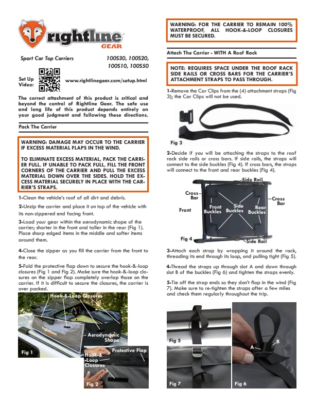 The Rightline Gear Sport 1 Car Top Carrier is 100% waterproof and attaches to vehicles WITH or WITHOUT a roof rack. Attach the carriers straps to a vehicle's roof rack or use the Car Clips to attach the straps to a vehicles door frame weather molding. The carrier is made from UV protected PVC Semi-Coated Mesh XT and Hydrotuff for maximum durability. The materials are sewn together for strength and then welded along the stitching to make the seam waterproof. The carrier's ZipRight System locates a urethane coated zipper on the protective zipper flap where water cannot enter. The Sport 1 is aerodynamically designed to save $$$ at the gas pump.